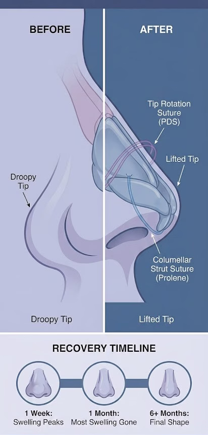 ⦁ Natural Aging: Suture-sculpted noses tend to age better than those where cartilage has been aggressively excised, which can sometimes look pinched years later.